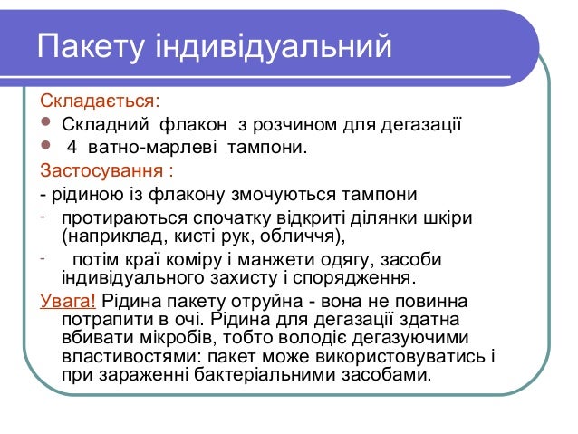 - 11. Пакету індивідуальний Складається: Складний флакон з розчином для дегазації 4 ватно-марлеві тампони. Застосування : - рідиною із флакону змочуються тампони - протираються спочатку відкриті ділянки шкіри (наприклад, кисті рук, обличчя), - потім краї коміру і манжети одягу, засоби індивідуального захисту і спорядження. Увага! Рідина пакету отруйна - вона не повинна потрапити в очі. Рідина для дегазації здатна вбивати мікробів, тобто володіє дегазуючими властивостями: пакет може використовуватись і при зараженні бактеріальними засобами.