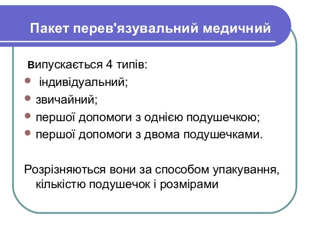 - 12. Пакет перев'язувальний медичний Випускається 4 типів: індивідуальний; звичайний; першої допомоги з однією подушечкою; першої допомоги з двома подушечками. Розрізняються вони за способом упакування, кількістю подушечок і розмірами