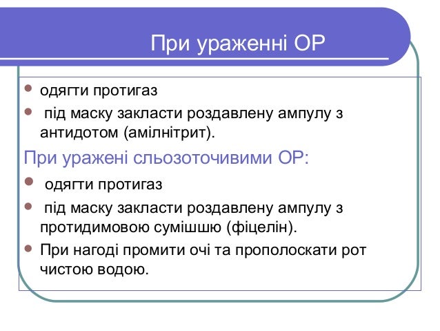 - 14. При ураженні ОР одягти протигаз під маску закласти роздавлену ампулу з антидотом (амілнітрит). При уражені сльозоточивими ОР: одягти протигаз під маску закласти роздавлену ампулу з протидимовою сумішшю (фіцелін). При нагоді промити очі та прополоскати рот чистою водою.