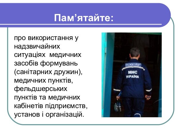 - 15. Пам’ятайте: про використання у надзвичайних ситуаціях медичних засобів формувань (санітарних дружин), медичних пунктів, фельдшерських пунктів та медичних кабінетів підприємств, установ і організацій.