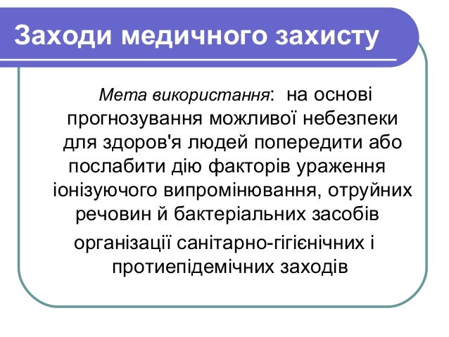 - 2. Заходи медичного захисту Мета використання: на основі прогнозування можливої небезпеки для здоров'я людей попередити або послабити дію факторів ураження іонізуючого випромінювання, отруйних речовин й бактеріальних засобів організації санітарно-гігієнічних і протиепідемічних заходів
