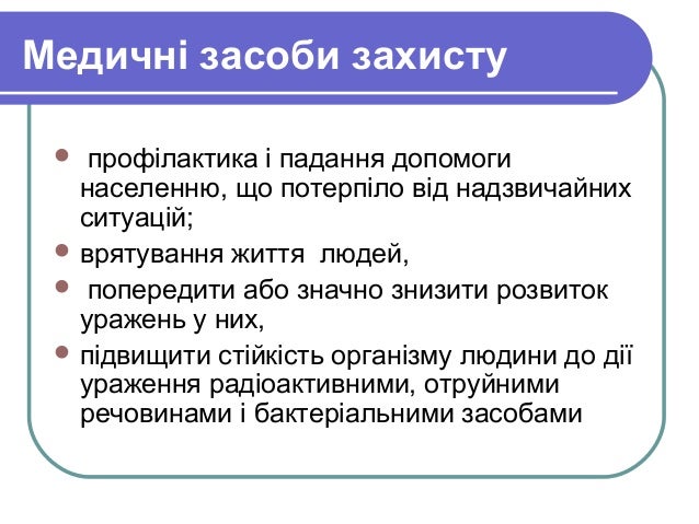 - 3. Медичні засоби захисту профілактика і падання допомоги населенню, що потерпіло від надзвичайних ситуацій; врятування життя людей, попередити або значно знизити розвиток уражень у них, підвищити стійкість організму людини до дії ураження радіоактивними, отруйними речовинами і бактеріальними засобами