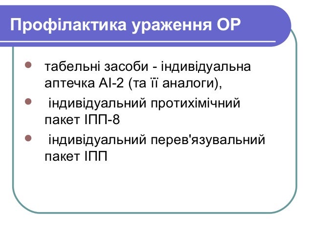 - 4. Профілактика ураження ОР табельні засоби - індивідуальна аптечка АІ-2 (та її аналоги), індивідуальний протихімічний пакет ІПП-8 індивідуальний перев'язувальний пакет ІПП