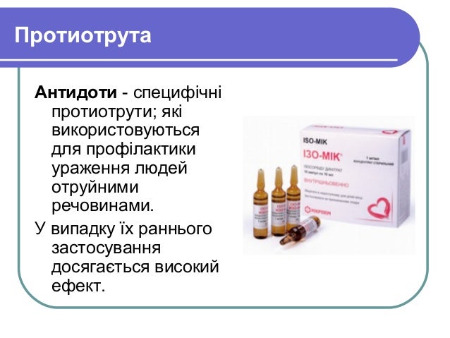 - 6. Протиотрута Антидоти - специфічні протиотрути; які використовуються для профілактики ураження людей отруйними речовинами. У випадку їх раннього застосування досягається високий ефект.