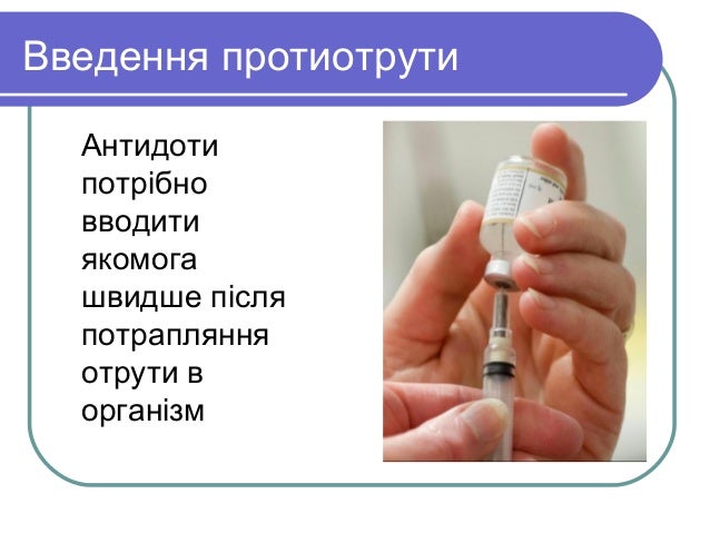 - 7. Введення протиотрути Антидоти потрібно вводити якомога швидше після потрапляння отрути в організм