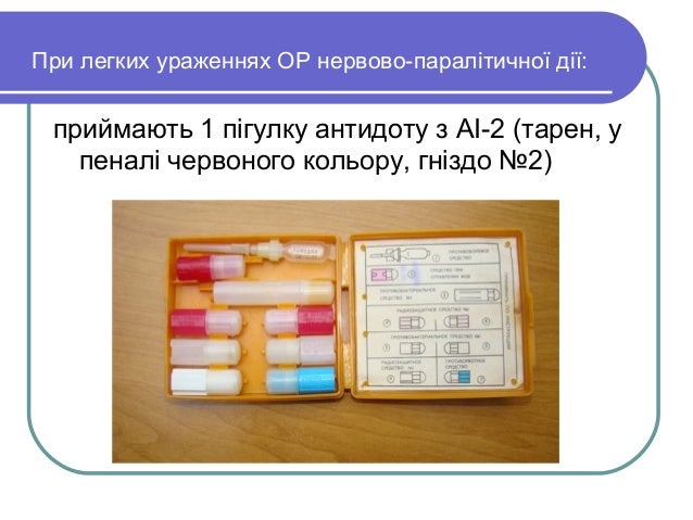 - 8. При легких ураженнях ОР нервово-паралітичної дії: приймають 1 пігулку антидоту з АІ-2 (тарен, у пеналі червоного кольору, гніздо №2)