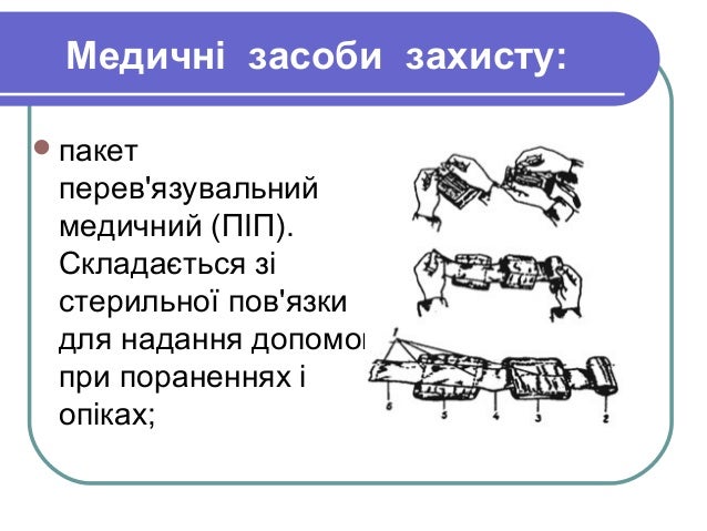 - 9. Медичні засоби захисту: пакет перев'язувальний медичний (ПІП). Складається зі стерильної пов'язки для надання допомоги при пораненнях і опіках;